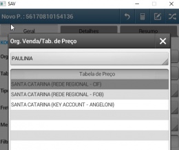 Na tela do dispositivo mobile onde selecionamos a organização de vendas e Tabela de preço.
