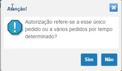 - Na tela de aprovação de pedido quando clicar em Aprovar, o sistema apresentará um alerta com a seguinte mensagem: Autorização refere-se a esse único pedido ou a outros pedidos por tempo determinado?
