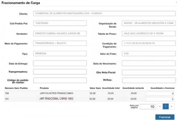 Será possível realizar o fracionamento de pedidos através da tela de fracionamento de pedidos. Os clientes que tem pedidos que não estejam em carga, não existam pendências, que ainda não estejam fracionados em sua totalidade, e que não estejam exportados para o ERP, estão aptos a compor a lista de pedidos a serem fracionados.