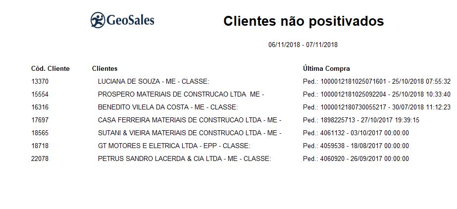 Atualmente dentro do portal GeoSales, é disponibilizado um relatório de clientes não positivados, que é utilizado para visualizar os pedidos que os clientes retiraram em um determinado período de tempo. Neste relatório é permitido que sejam aplicados filtros, como: período, supervisor, vendedor, rota, grupo de cliente, cliente, organização de venda, família de produto e produto.