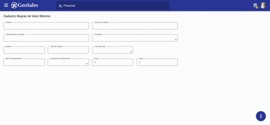 Atualmente o GeoSales disponibiliza a parametrização de regras de valor mínimo, que é utilizada para definir o cenário mínimo ideal de cadastro de pedidos.